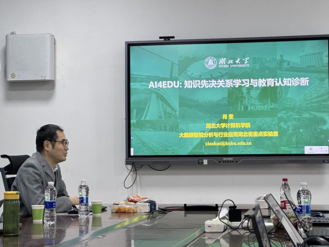 近日,受浙江全省智能教育技术与应用重点实验室邀请,湖北大学计算机学院教授、博士生导师、中国计算机学会(CCF)副秘书长肖奎教授在17幢105会议室作题为《AI4EDU:知识先决关系学习与教育认知诊断》的学术报告。实验室执行主任朱佳教授主持讲座,蓝敏、李笑樱、逯行、王希哲和管珏琪等多位教师出席。