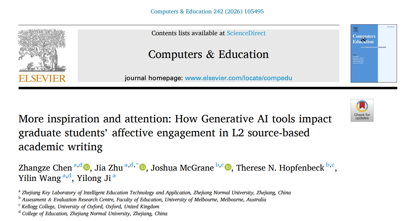 朱佳教授团队与墨尔本大学学者合作发表成果“More inspiration and attention: How Generative AI tools impact graduate students’affective engagement in L2 source-based academic writing”,发表于教育技术顶刊《Computers & Education》。研究采用随机对照实验(RCT),从问卷与屏幕回放刺激回忆、半结构访谈等多源数据评估学习者在不同写作阶段的情感投入变化。