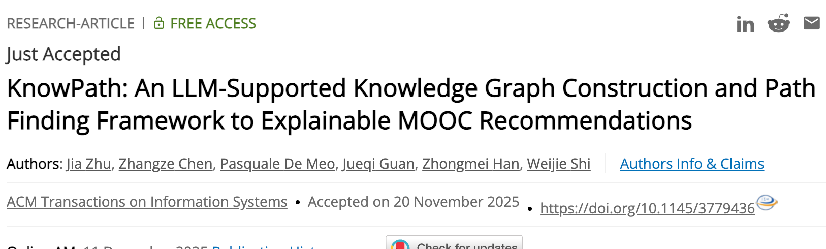 朱佳教授团队与香港科技大学、意大利墨西拿大学等单位的学者合作发表论文 “KnowPath: An LLM-Supported Knowledge Graph Construction and Path Finding Framework to Explainable MOOC Recommendations”,发表于CCF A类期刊《ACM Transactions on Information Systems(TOIS)》。论文面向MOOC海量课程带来的“信息过载”和“推荐可解释性不足”等问题,提出KnowPath推荐框架:利用开源大语言模型构建能够刻画学习者、课程、教师与资源等多实体关系的知识图谱,并结合强化学习在图谱中寻找可解释路径,以生成更透明的推荐依据。